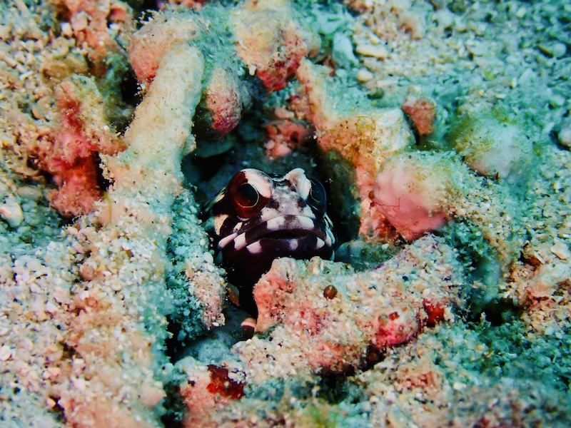 真っ青な洞窟に砂地にはニシキアナゴにハダカハオコゼの白色。