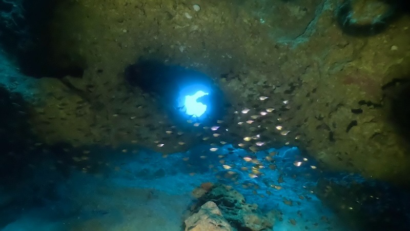 青いスポットライトとアカマツカサの群れ。